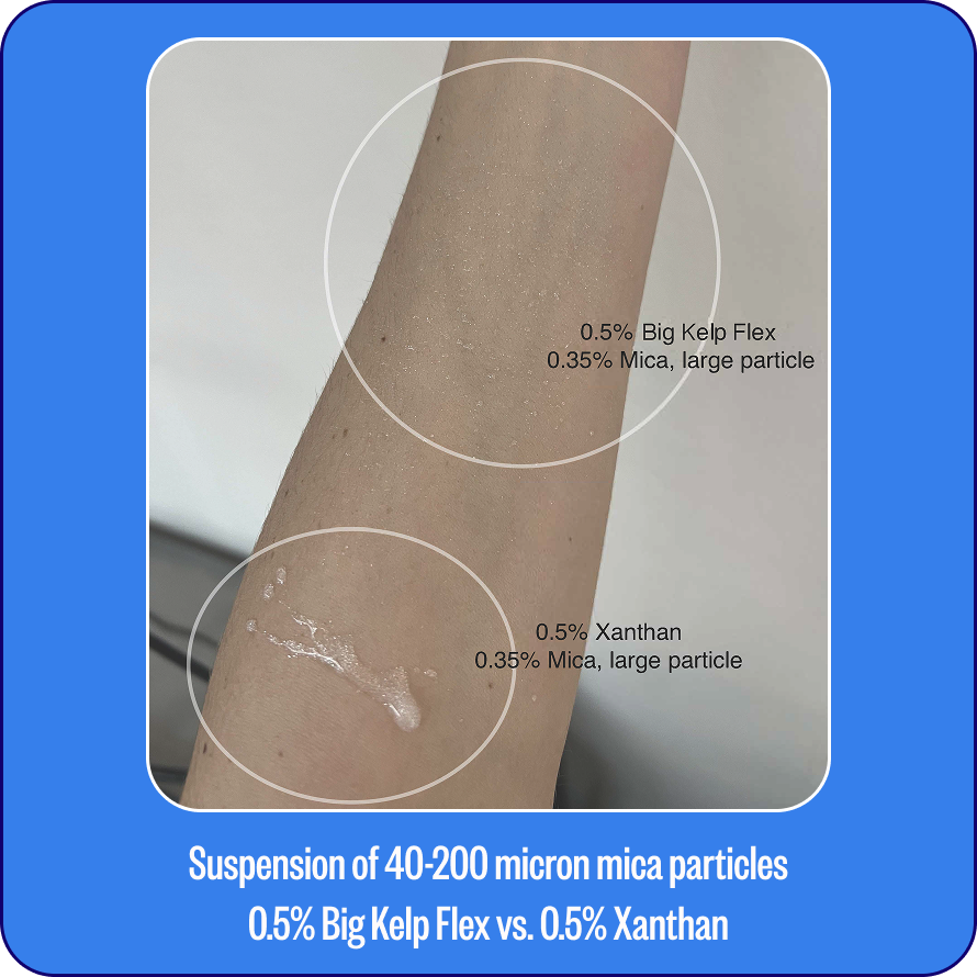 From suspensions to textures, Big Kelp Flex is, well, incredibly flexible. You can use it to create a structure strong enough to suspend high density particles like zinc, titanium, mica or color pigments, even in very low-viscosity systems. You can also use it to create a wide range of velvety smooth textures combined with an excellent quick-break skin feel without the tackiness commonly associated with xanthan gum and other natural rheology modifiers.