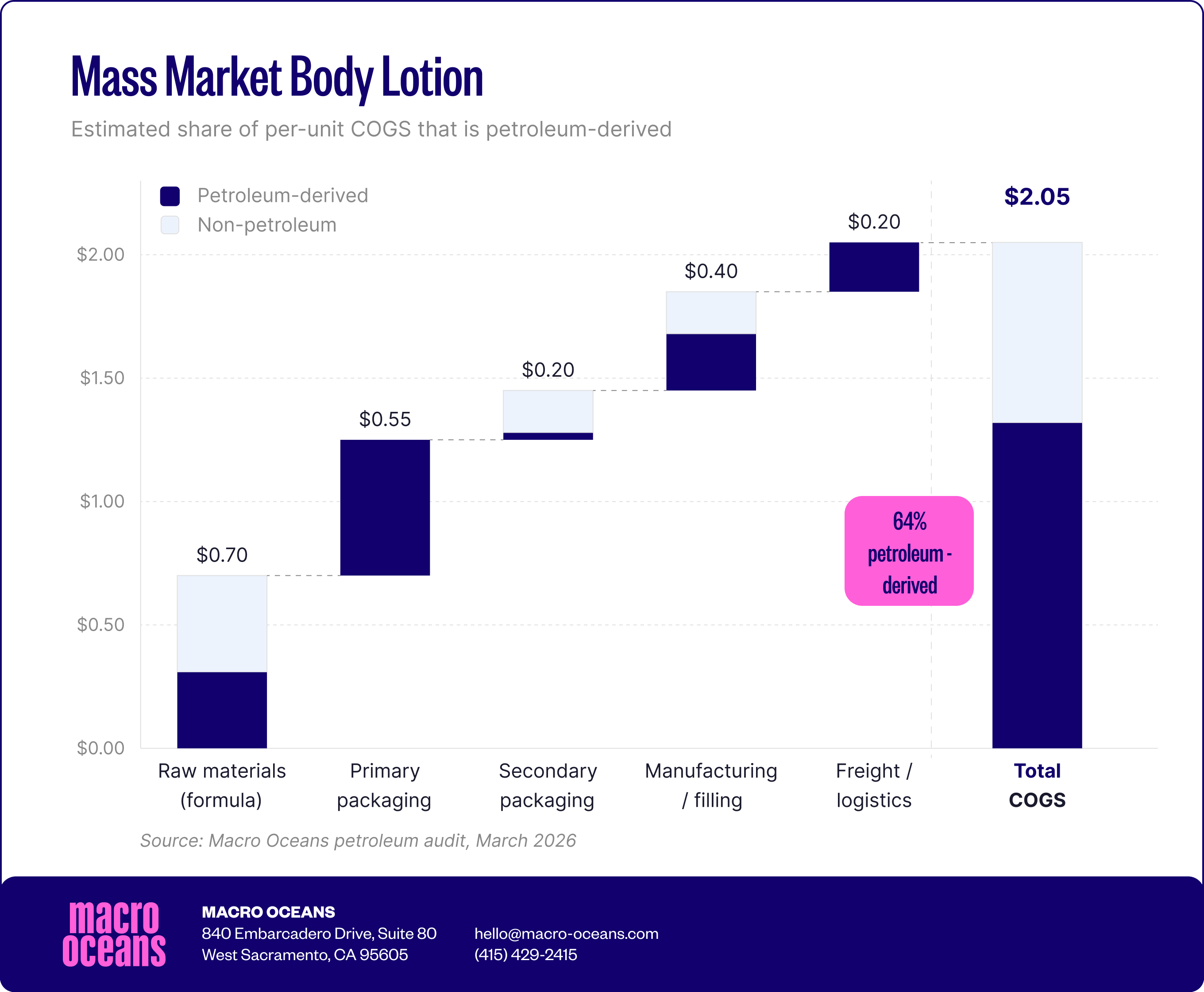 When you add it all up, roughly two-thirds of the total cost to produce and ship one unit of a typical mass-market body lotion is built on petroleum-derived inputs.